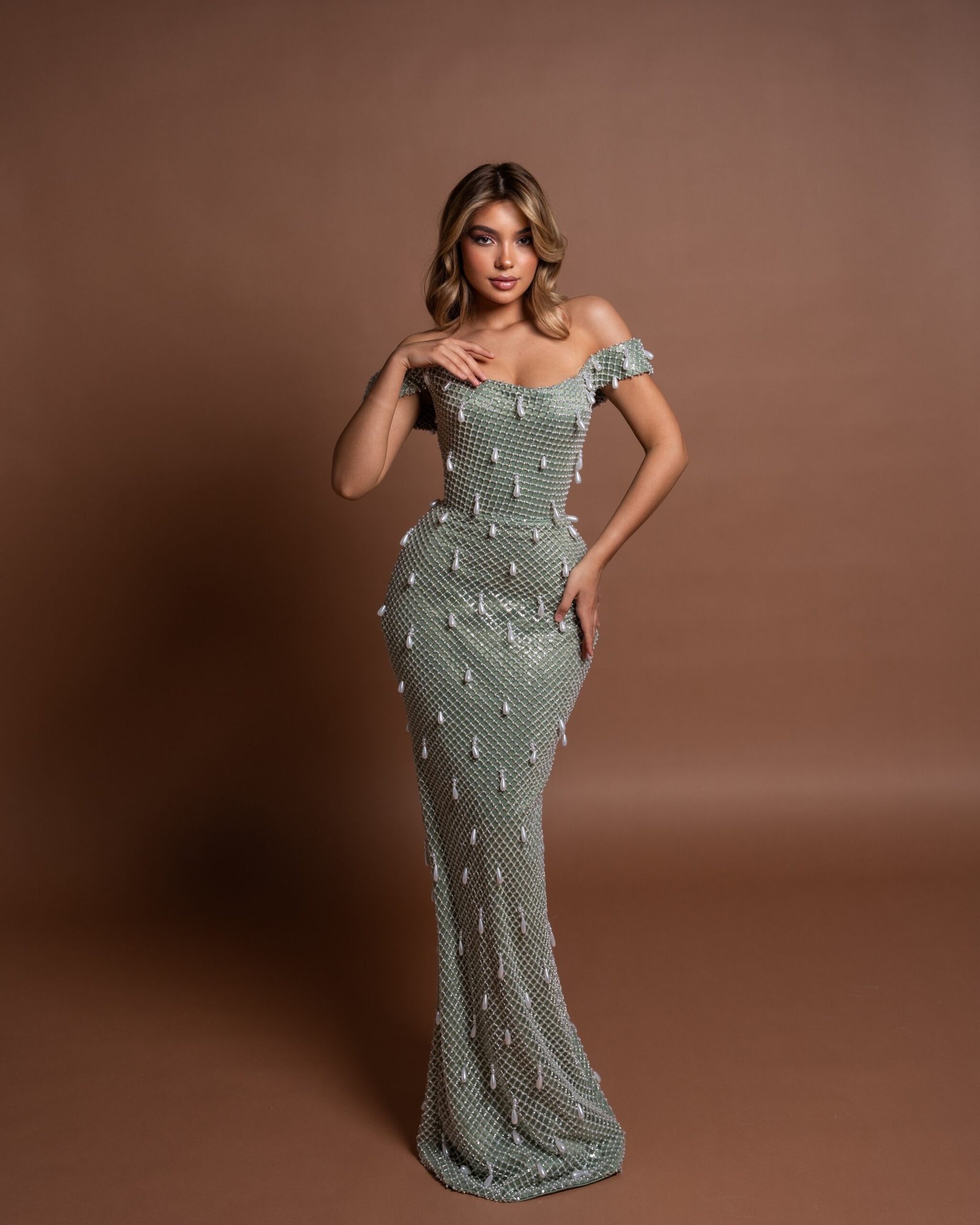 Cascade is a mint gown delicately adorned with pearl drops that shimmer like raindrops, giving the dress a unique and graceful charm. The standout feature is the beautifully shaped bow detail that enhances the neckline, drawing attention to the décolleté in an elegant and refined way. A perfect balance of softness and sophistication.