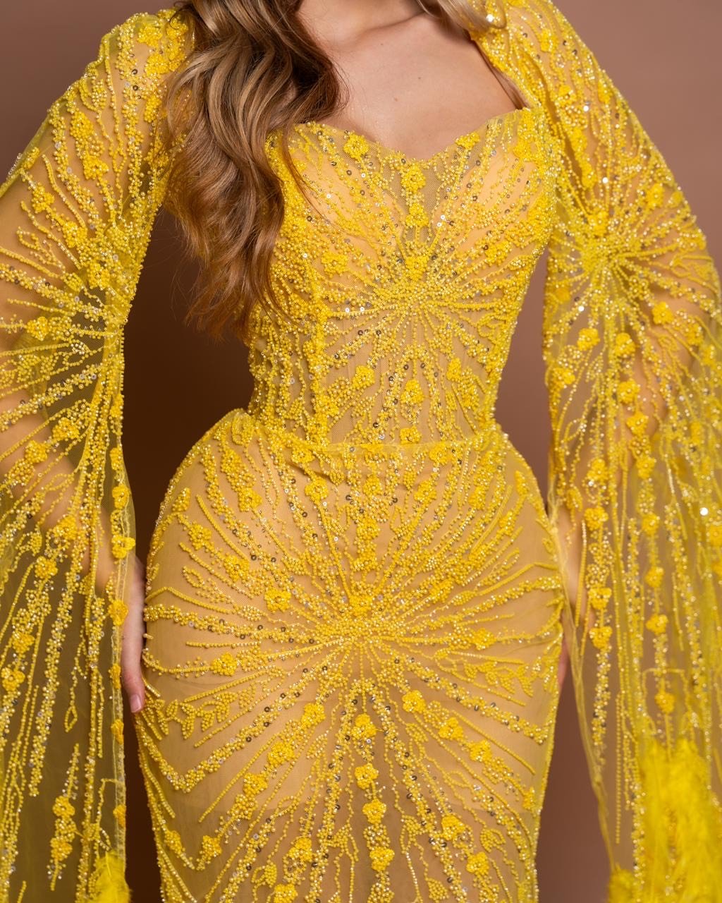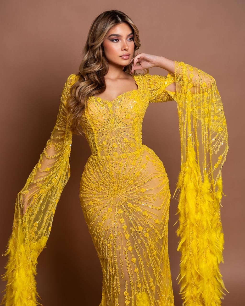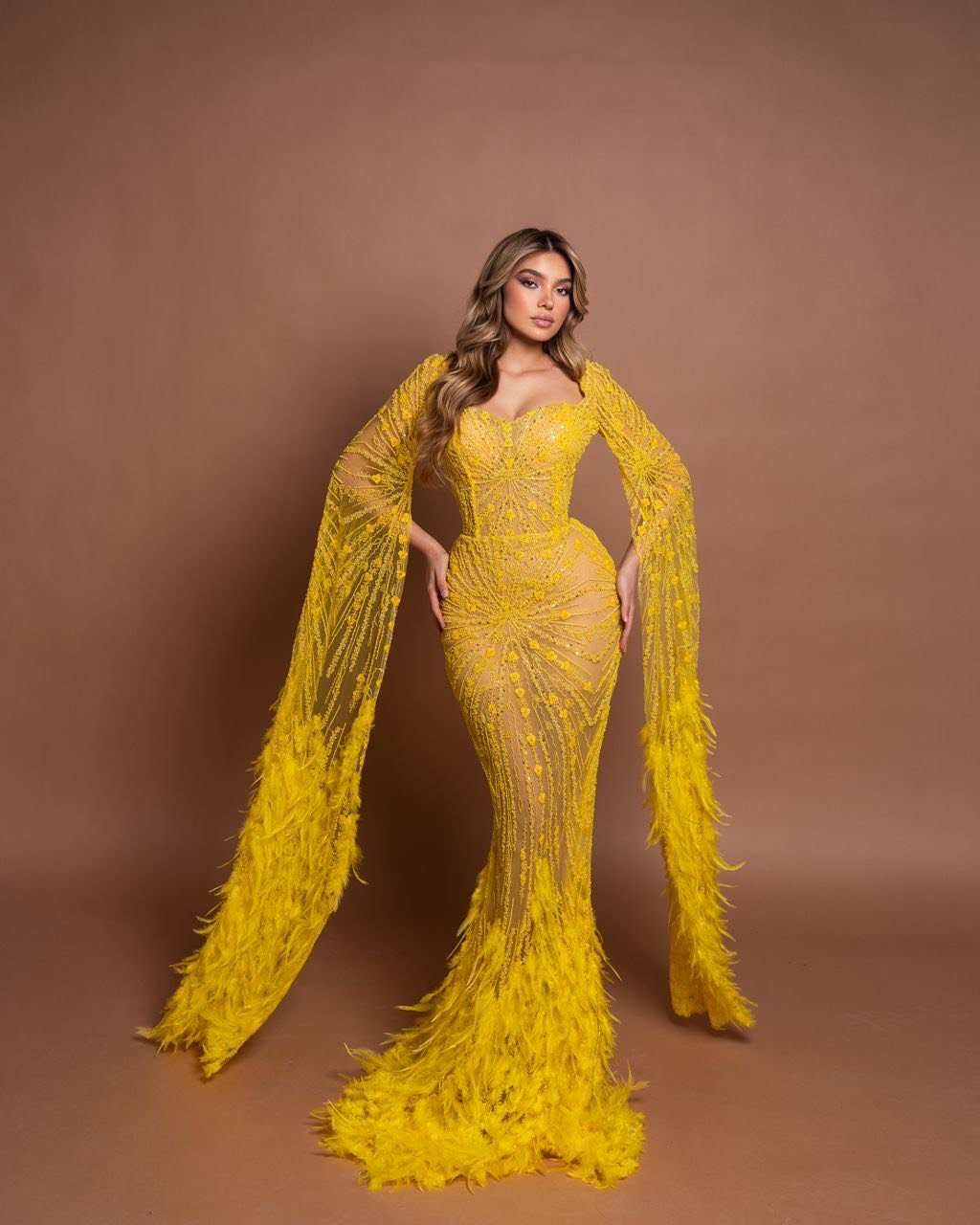 Lemon Luxe is a radiant yellow mermaid gown that glows with intricate embellishments and a bold, elegant design. The dress features long fitted sleeves that flow into dramatic feathered cuffs, echoing the feather details at the hem of the mermaid skirt. The embellishments highlight the curves while the feathers add movement and flair, making this gown both glamorous and unforgettable.