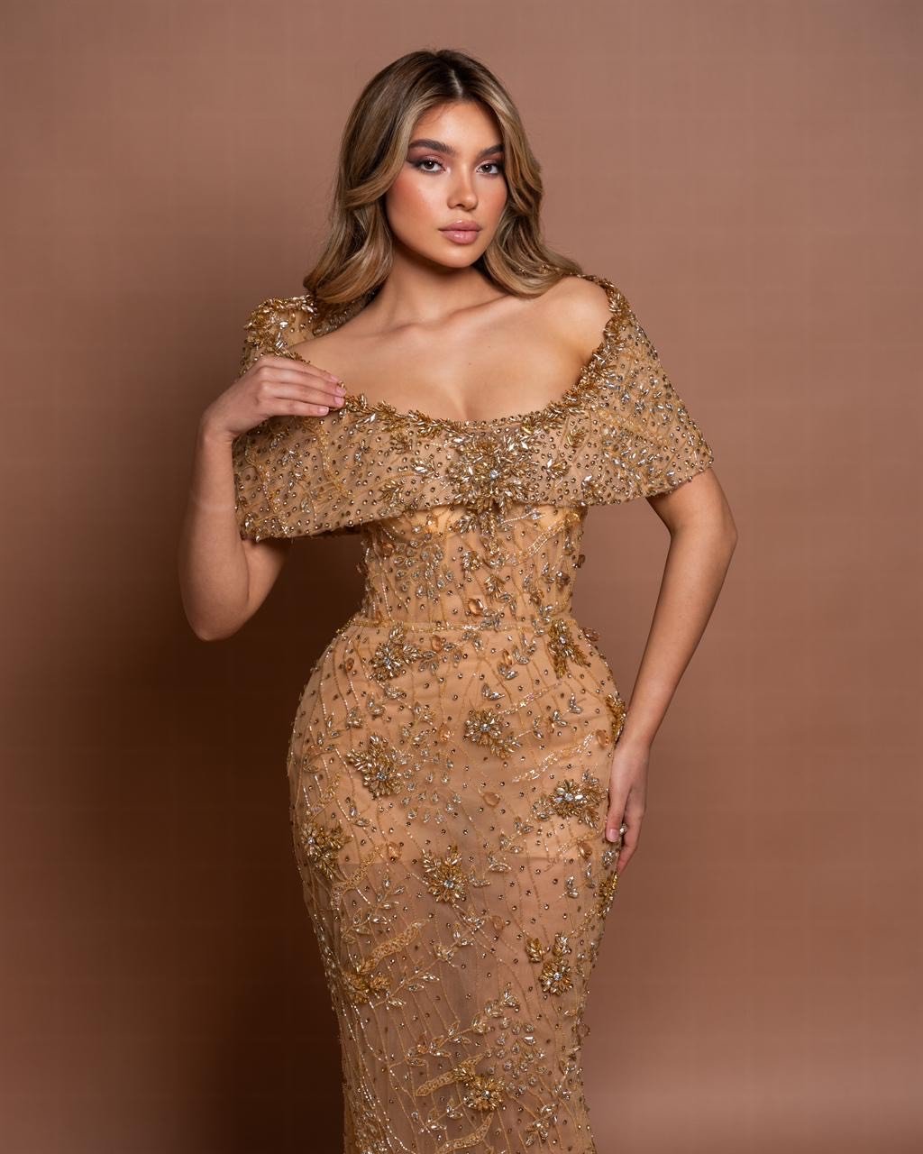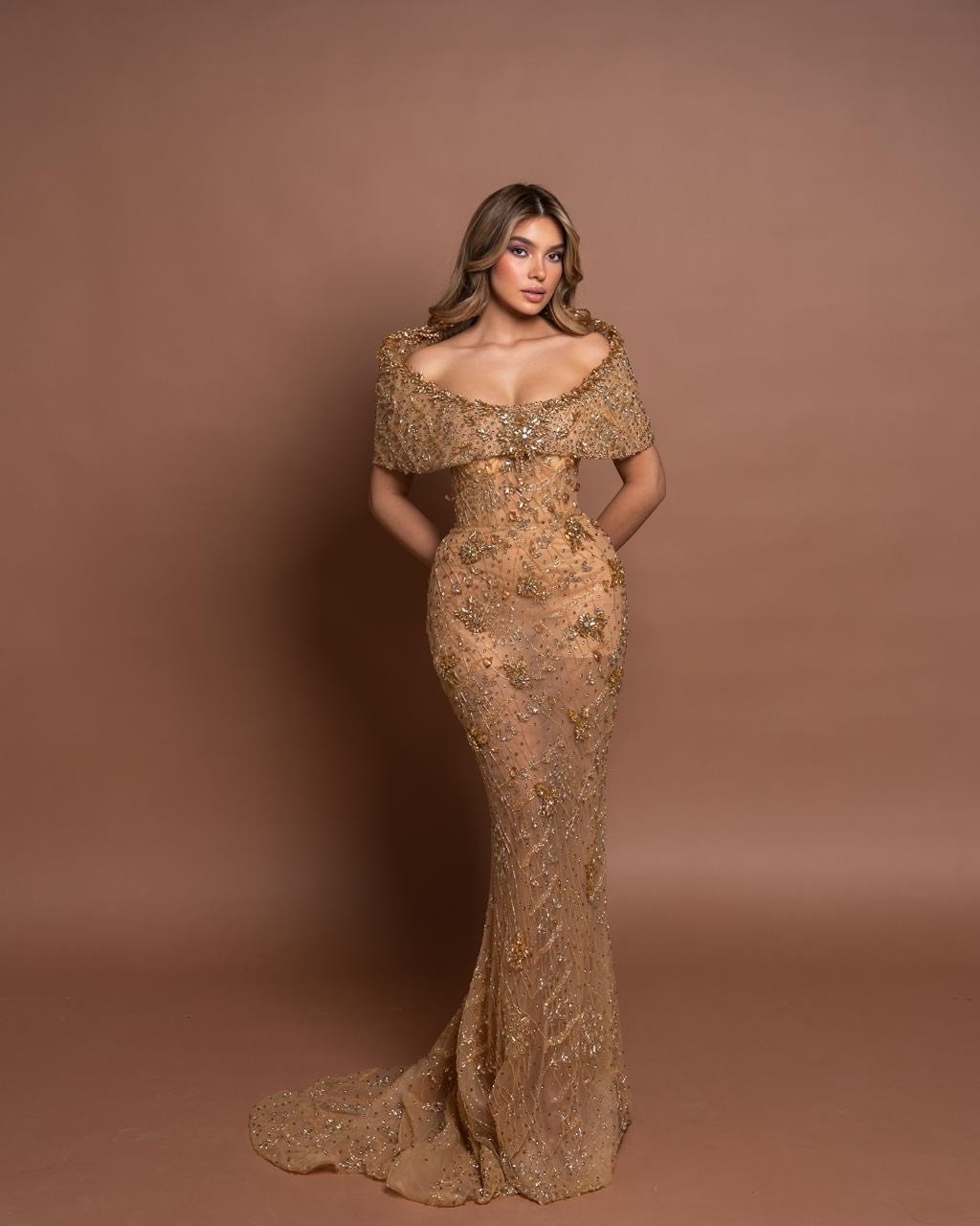 Majesty is a golden gown entirely embellished with gold crystals that shimmer with every movement. The standout detail is the unique shoulder piece, which highlights the neckline and adds a regal, majestic touch. This dress is designed to radiate luxury and elegance.