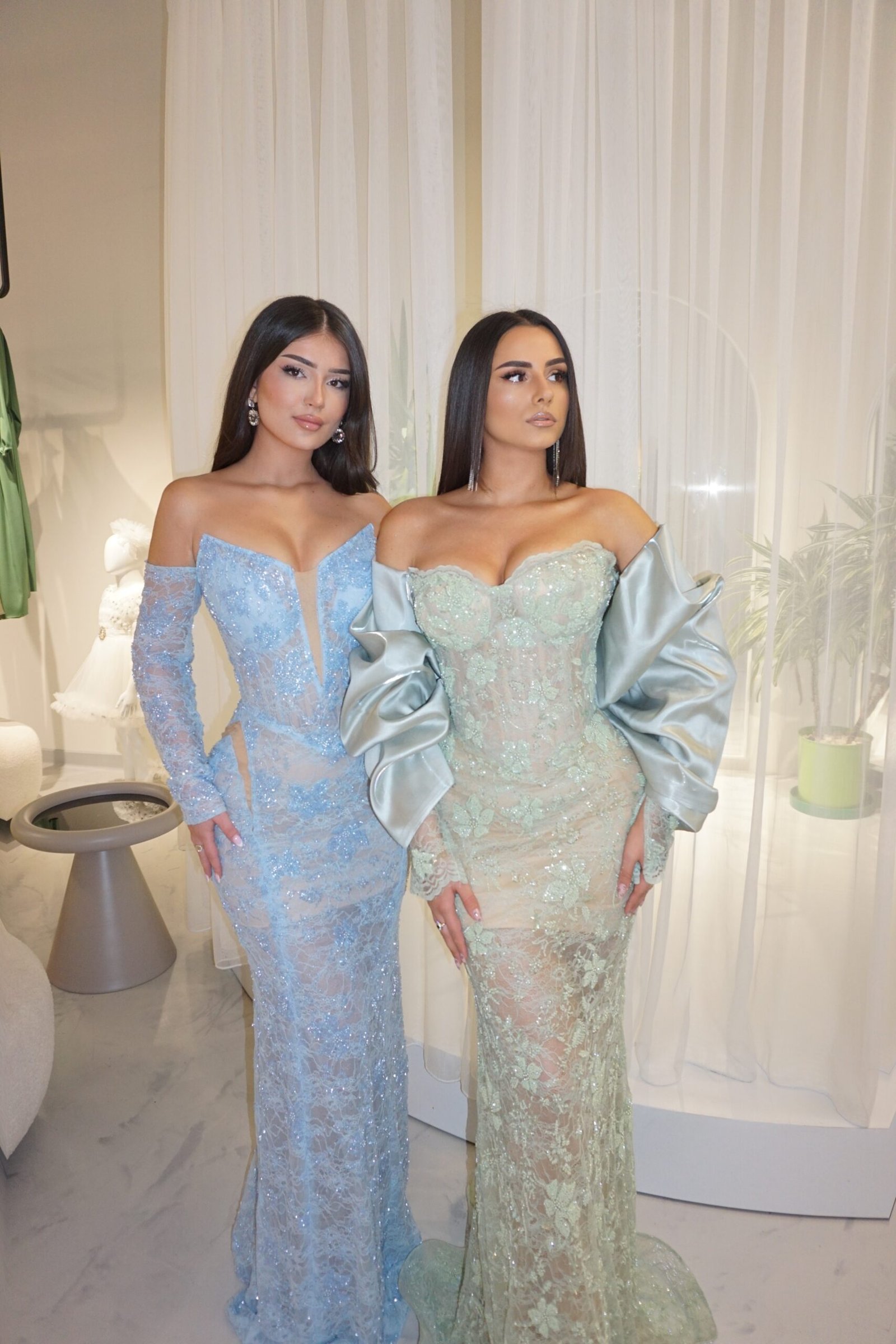 A dress that feels softly luminous in every frame, with a gentle mint hue that embodies purity, calm, and classic elegance. Its silhouette drapes effortlessly along the body, while the delicate bow adds a touch of refined femininity — a subtle detail that turns the dress into an unforgettable moment.